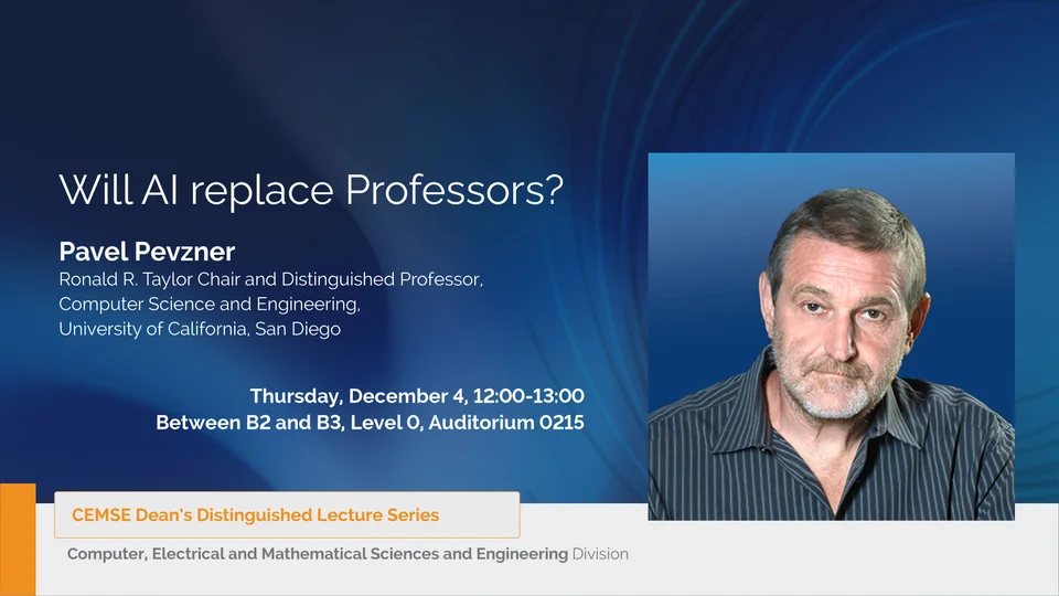Will AI Replace Professors? Pavel Pevzner, Ronald R. Taylor Chair and Distinguished Professor, Computer Science and Engineering, University of California, San Diego Dec 4, 12:00 - 13:00 B2/B3 L0 A0215